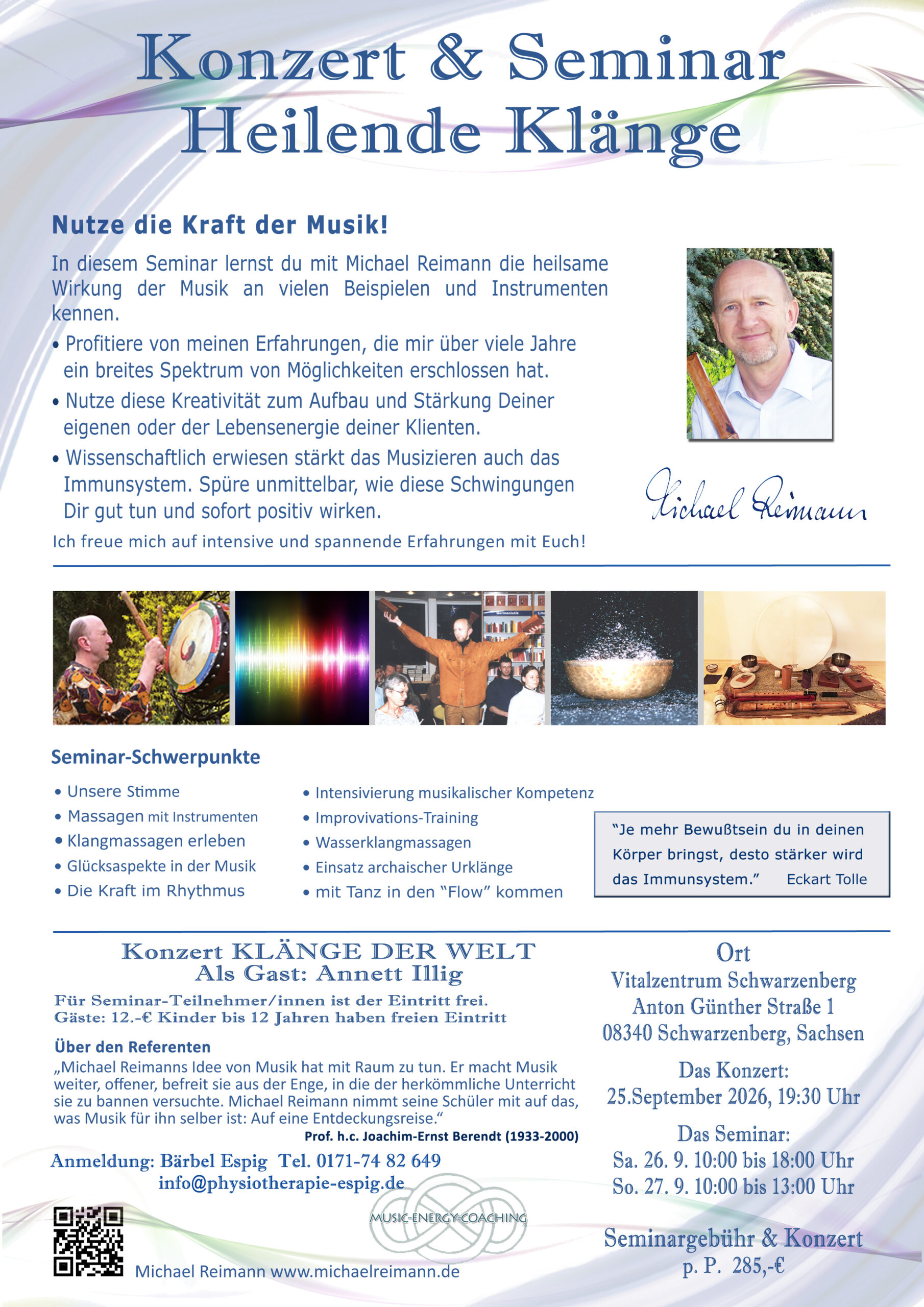 Am Freitag Abend den 25.September 2026, 19:30 Uhr starten wir mit dem Konzert KLÄNGE DER WELT Als Gast wird Annett Illig dabei sein. Für Seminar-Teilnehmer/innen ist der Eintritt frei. Gäste: 12.-€ Kinder bis 12 Jahren haben freien Eintritt